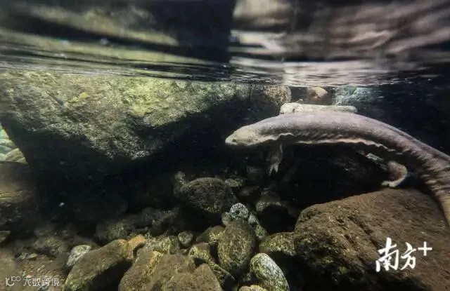 万坑河段,一条人工放流的娃娃鱼出现在溪涧的乱石中。