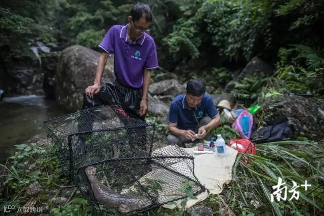 黄畅生(右)和巡护员李家建对一条诱捕上来的娃娃鱼进行检查。