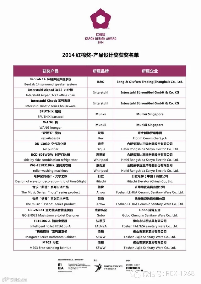 近日,从红棉奖组委会传来消息,意大利rex(锐思)瓷砖凭借Alabastri(汉妮玉)产品和丹麦B&O音响、德国Interstuhl办公家具、新加坡Munkii 家具、日本SANYO(三洋)电器、日本HITACHI(日立)电梯、美国Whirlpool(惠而浦)电器等国际知名品牌,以及中国哲品家居、生活家家居等国内知名品牌共计53个年度产品当选2014年度红棉奖,获得“2014红棉奖—产品设计奖”,赛事进入在线公示阶段(公示网站:广州国际设计周官方网站