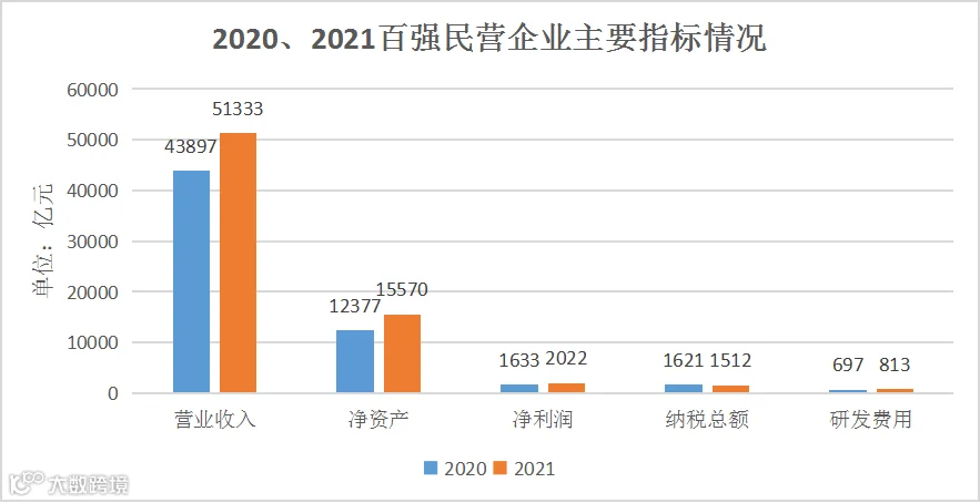 百强民企营收总额达到51333亿元,相较上一年的43897亿元增长16.9%。销售额突破3000亿元的民企从去年的1家增加到2家。2020年度销售额突破千亿元的企业达到11家,总营收21478亿元,占百强民企总营收的41.8%。