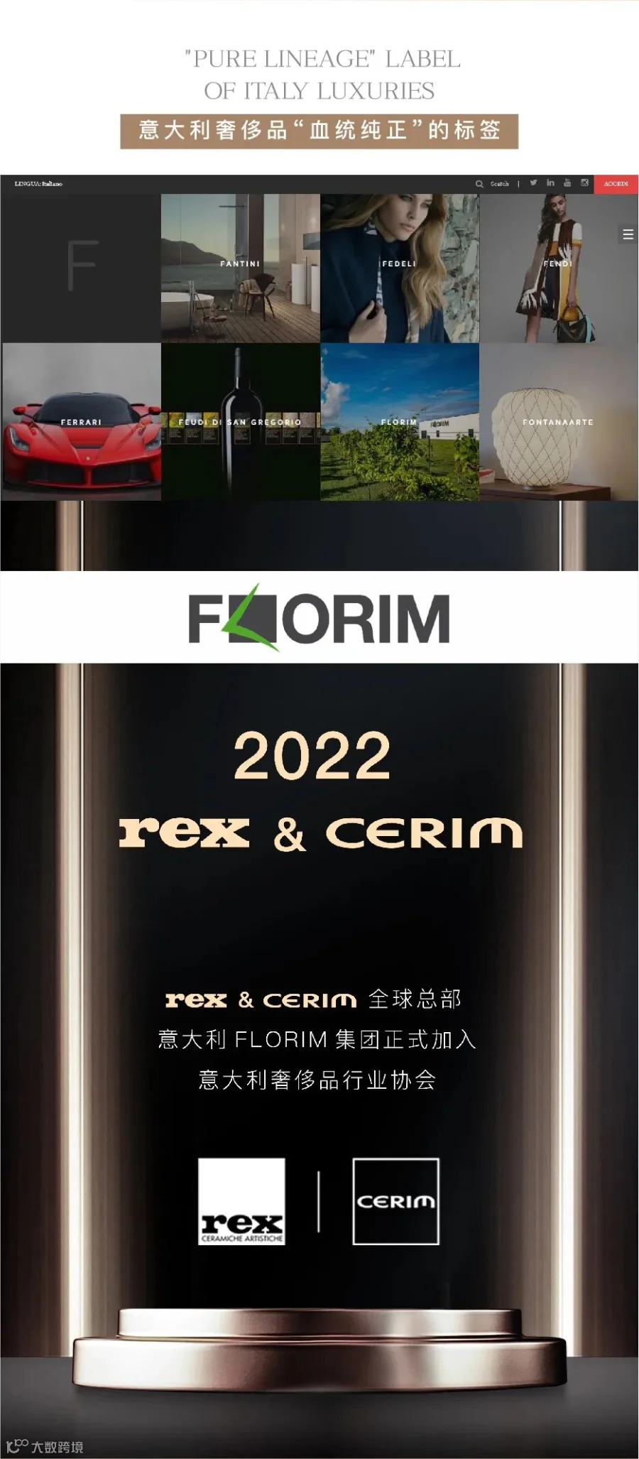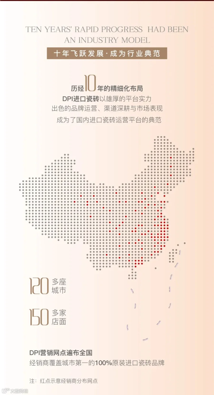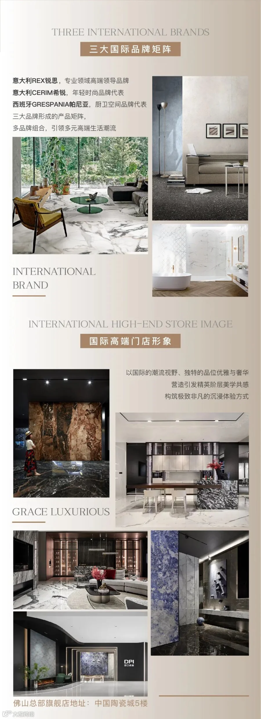 DPI定位于“进口瓷砖”,致力于原装进口高端建材产品,打造进口建材产品运营平台,为国内客户构筑一种优雅、奢华的生活方式,现已经代理了意大利REX锐思瓷砖、意大利CERIM希锐瓷砖、西班牙GRESPANIA帕尼亚瓷砖三大国际瓷砖品牌。