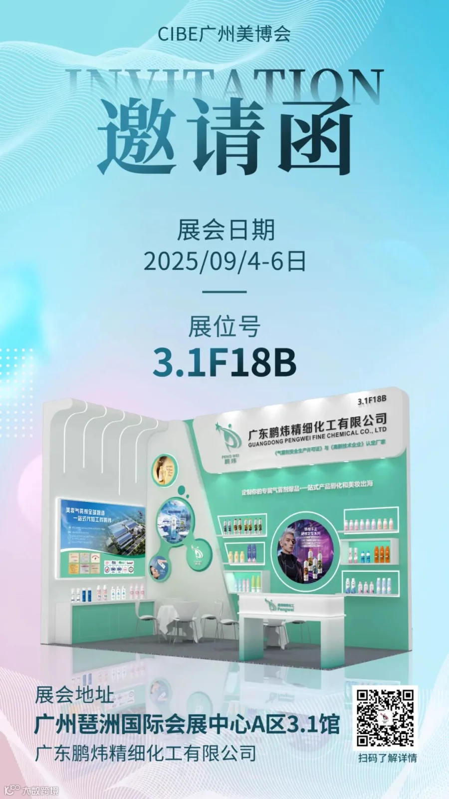 2025年CIBE广州美博会即将开启!广东鹏炜精细化工有限公司诚邀您于 2025年9月4 - 6日 ,亲临 广州琶洲国际会展中心A区3.1馆F18B展位 ,共探美妆气雾剂领域的前沿技术与创新成果。