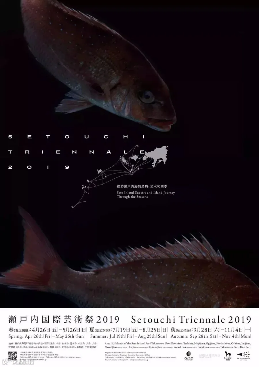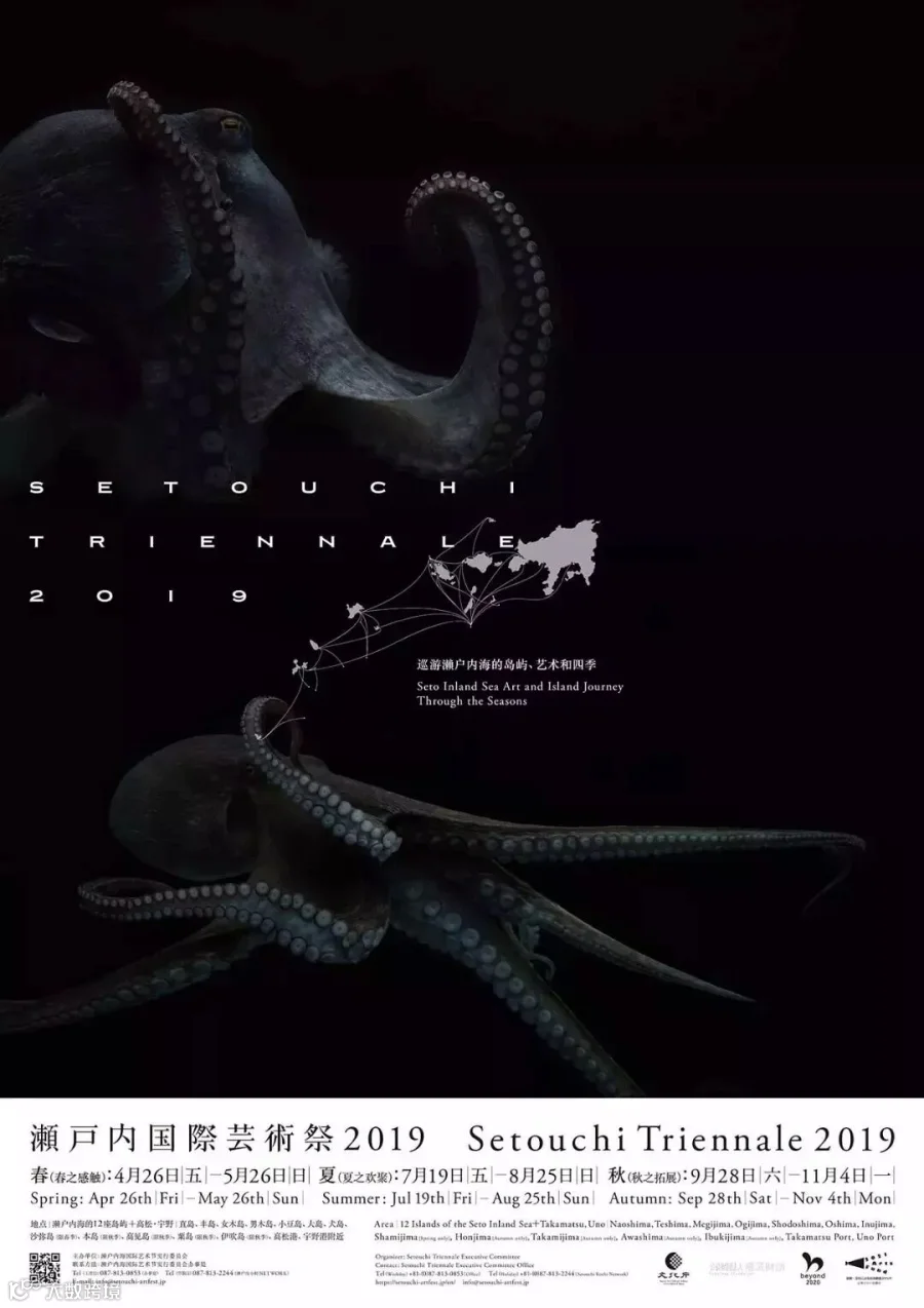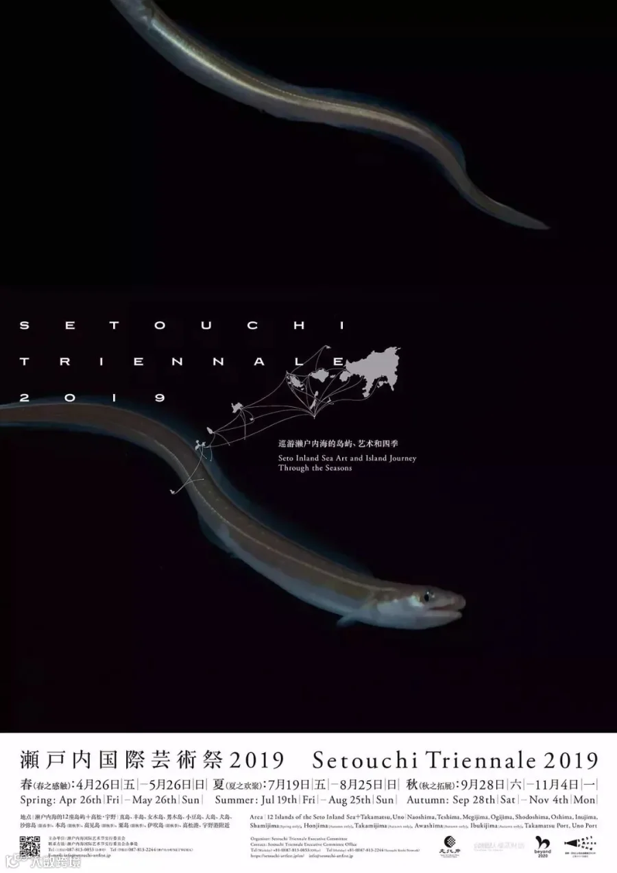 尤为值得一提的是,今年艺术节视觉主题是“海中生物”,由原研哉设计创作。海报主色调采用黑色,留给人足够的想象空间。画面中的“章鱼、鲷鱼和海鳝”,便是与濑户内居住的人们息息相关的海中生物,以栖息于海底的生物为素材,打破了传统视觉习惯,也正体现出了濑户内的魅力之所在。