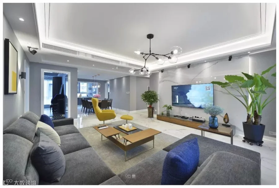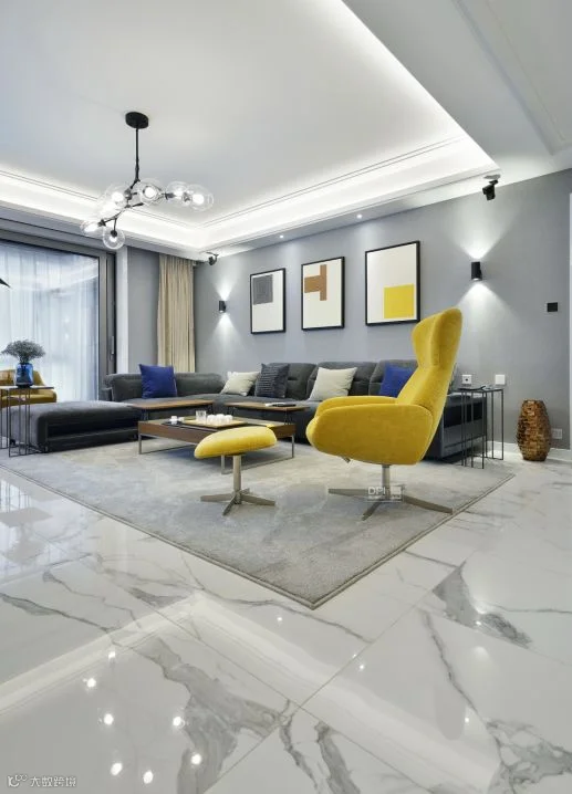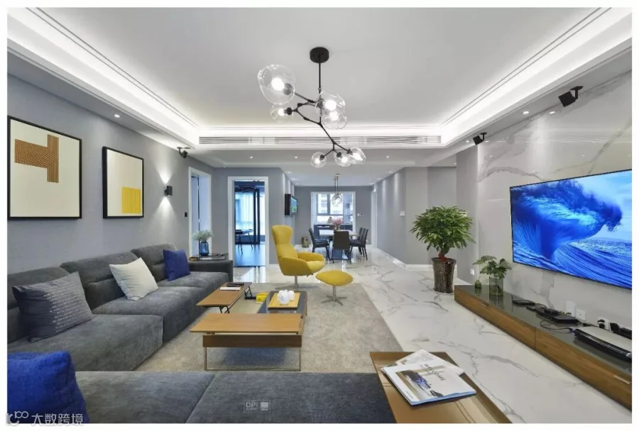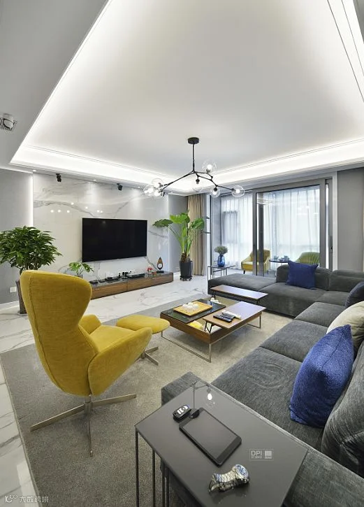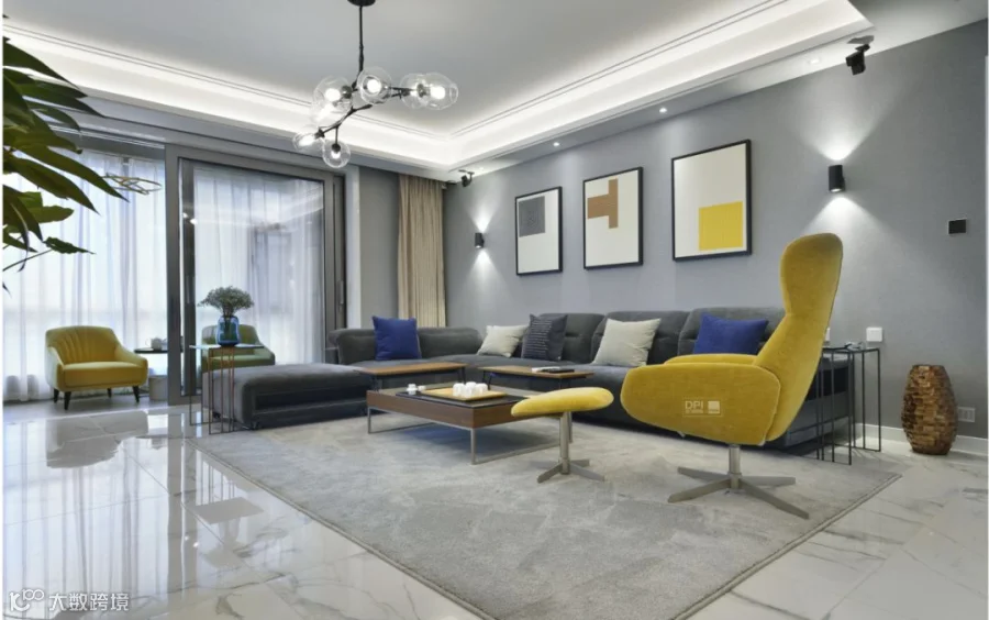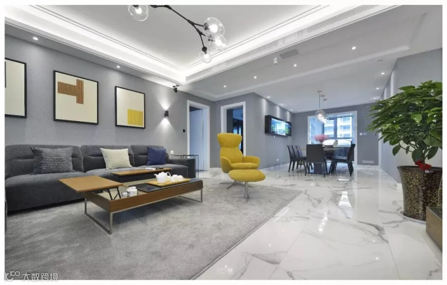 客厅整体采用了珍稀雪花白的材质,与墙面灰色的壁布的搭配,衬托出家具的灵动。高级灰的运用在本案中分了几个层次去体现,配以黄色的休闲椅给这个中性的基调当中带来了不同的灵动。