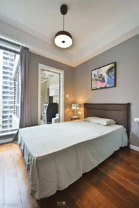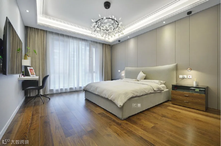主卧的蝴蝶灯,好似多个发光的蝴蝶在空中。柔美而精致的红铜掉线阅读灯,体现出了主人对于品质的追求。
