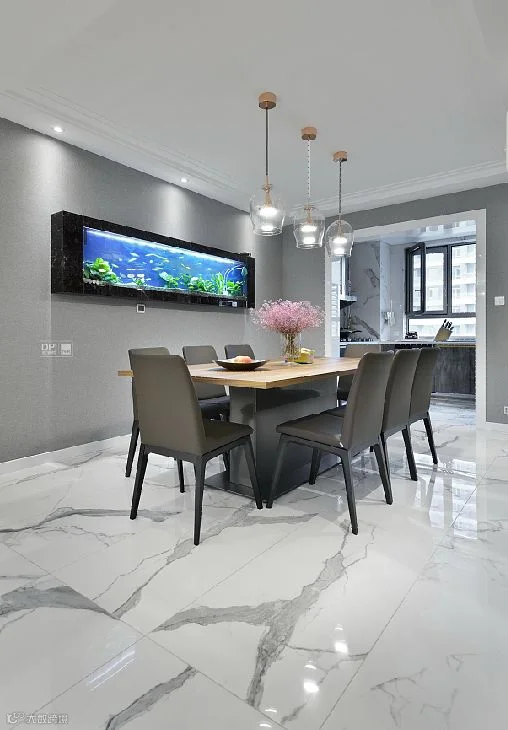 餐厅墙壁上的壁挂式鱼缸给就餐的环境带来不一样的生动气息,好像置身在大自然的氛围里是如此的和谐,精致的黄铜吊灯配以玻璃喇叭口的吊灯,好像一个个含苞待放的小花朵在说话一样一闪一闪的,透过玻璃诉说着女主人对于生活的美好追求。