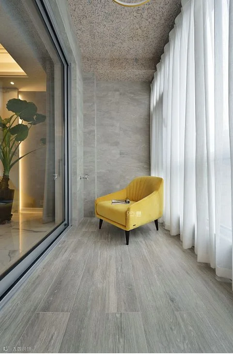 客厅阳台搭配了木地板质感的瓷砖和板岩质感的瓷砖结合上软木吊顶,整个空间想打造出一种自然的户外感,不同于室内的放松气息,黄色的单椅点亮了整个阳台。一个人一个咖啡,一个下午就这样度过。