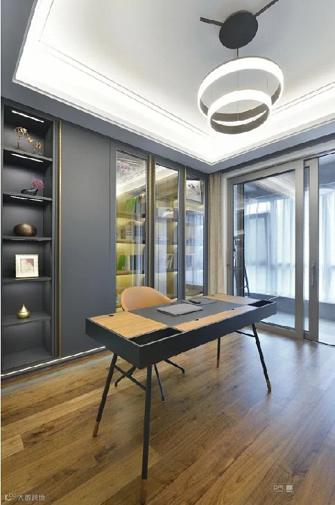 书房则是体现了男主的个性需求,精致的黑色书柜搭配灯光还有黄铜的拉手,高雅的气质不言而喻。轻巧的书桌打破了深色空间的压抑感。