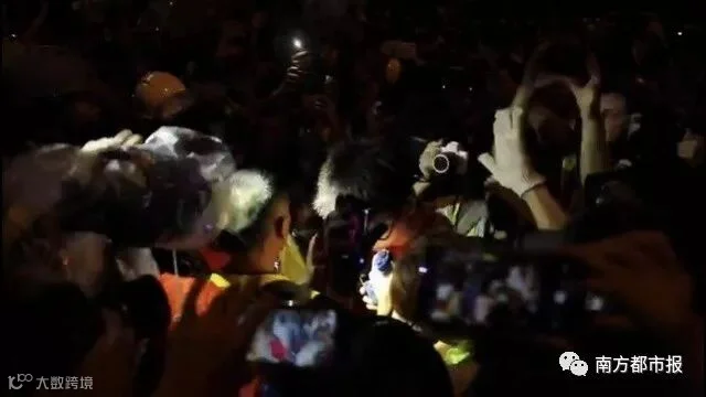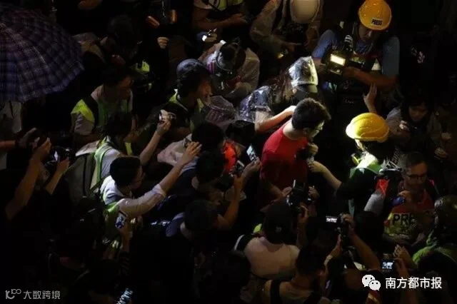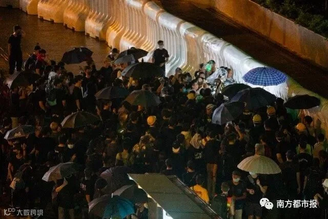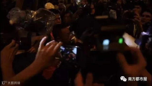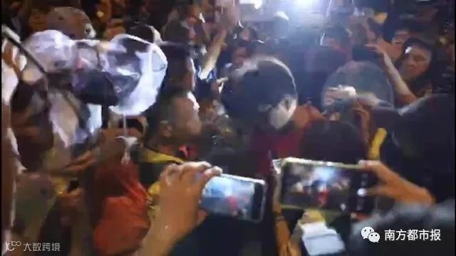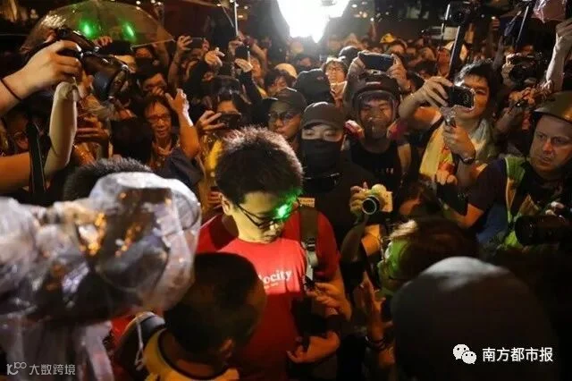 18日20时许,夏悫道北侧发生骚动,附近大批示威者突然聚集。南都记者看到,一名红衣男子被示威者团团围住,不时有激光笔照射其面部。