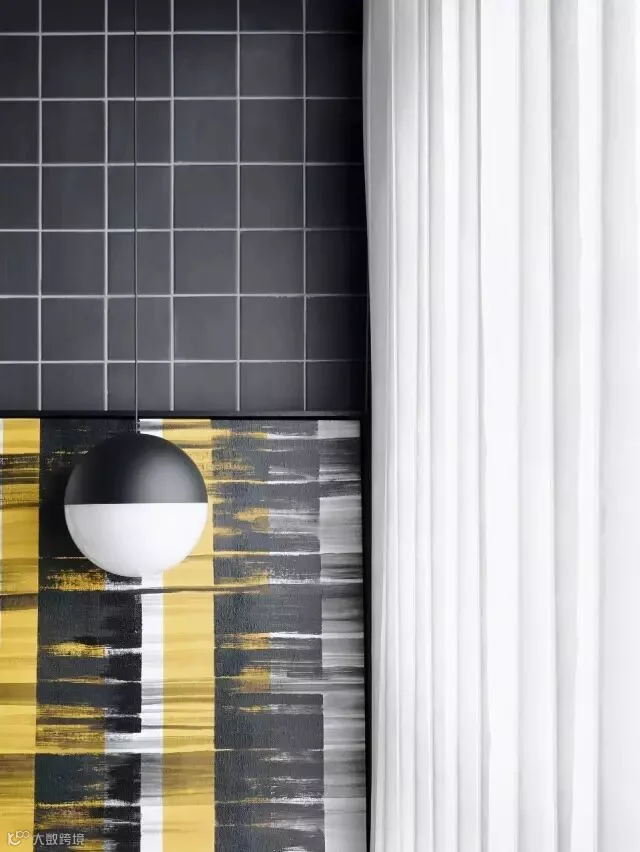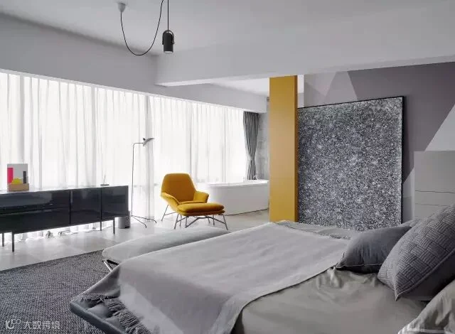 儿子房的整体设计也是延续了整个房子的色调,高级灰,特别之处就是在局部运用了明黄色作为点缀,体现年轻人的一种活力,颜色直击人心,另外在墙纸运用上也是花了点小心思,通过大小不同的二种三角形变化着整个空间,静谧中带有点跳跃,十分符合年轻人的一种氛围。