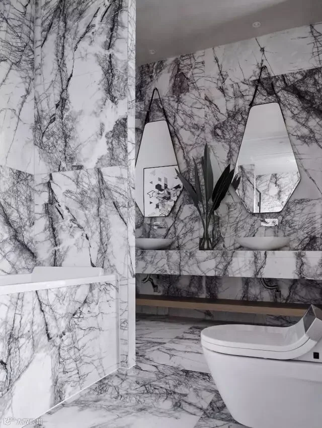主卫也是选用山水纹理的大理石,配上皮质铜镜,大叶的绿植,冷峻中带有一丝清新,在窗边设计了一个矮踏,洗完澡可以休憩,当你眼看窗外会发现种植了很多仙人掌,这也是设计师想给主人意外的惊喜,细心之处就在于此。