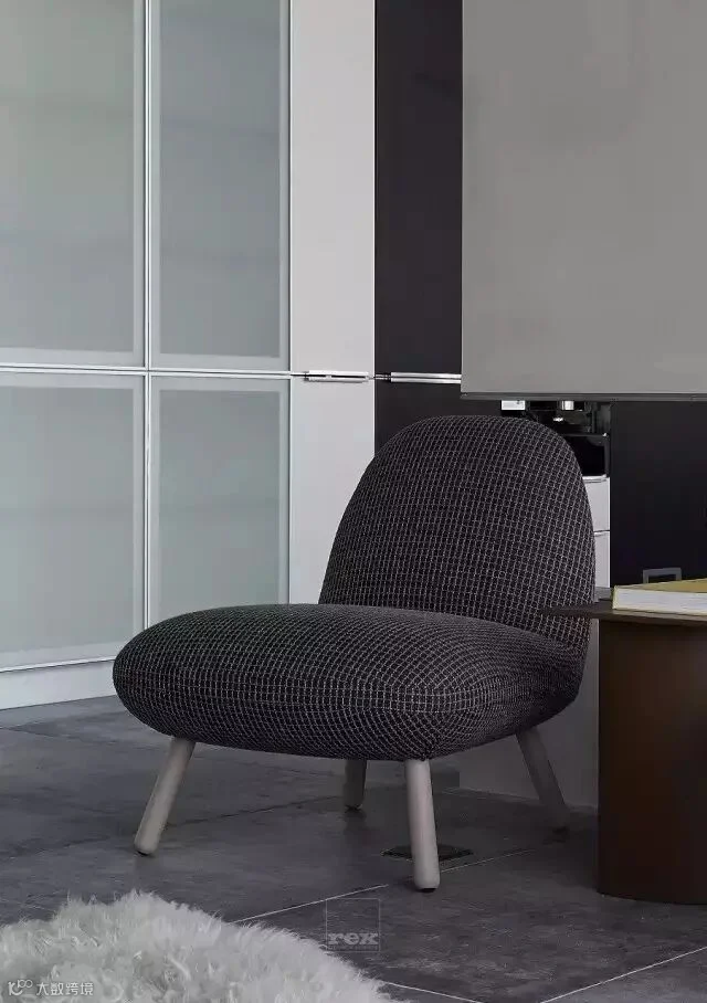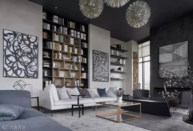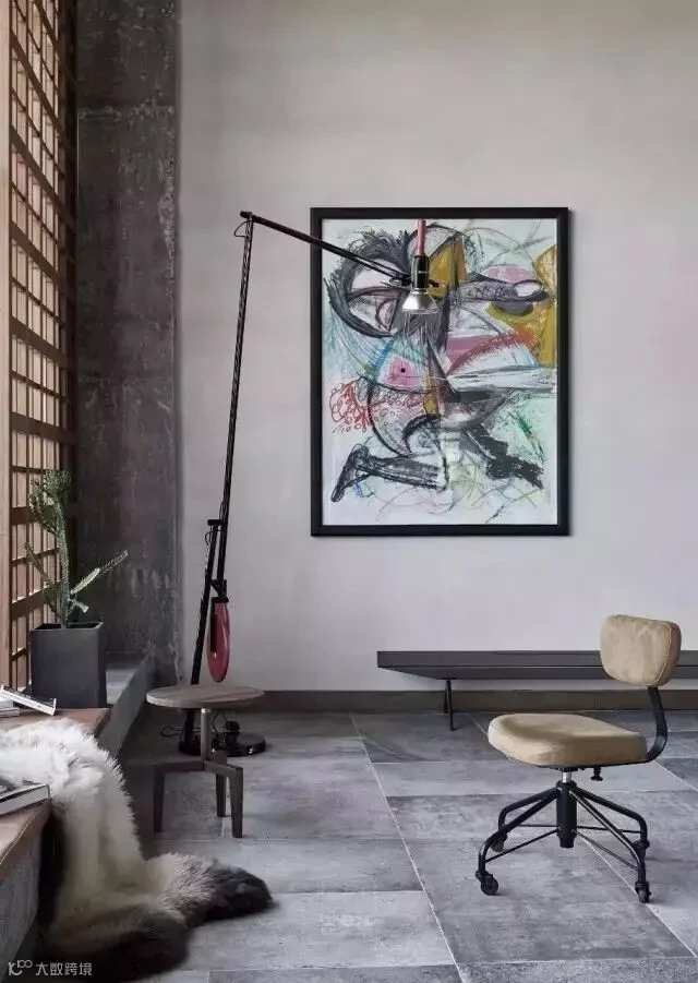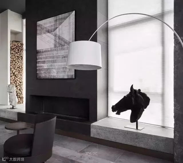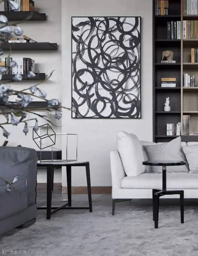 休闲区整体设计随意不做作,水磨石的地台配上真皮坐垫和毛垫,设计感超强的落地灯,极简的装饰墙柜,墙面则选择了一幅艺术家的抽象作品,让这个灰度空间里不再显得沉闷,整个以软装为主的空间,就是想给人带来自由,放松,惬意。在这里可以发呆,或看一场电影,当朋友聚会时,可以切换成红酒吧模式,微醺,畅谈理想等。