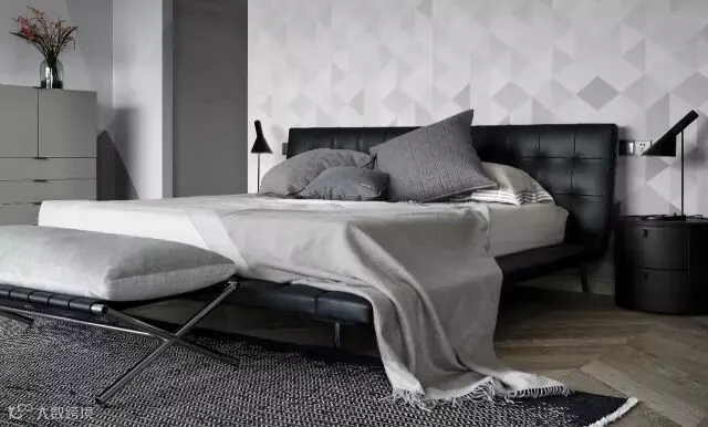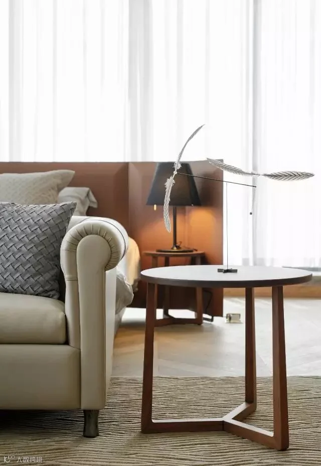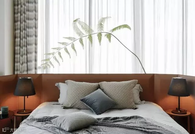 主卧空间比较大,床头采用凌空设计,自带床背的皮质设计体现一种简洁的品质,在床与落地玻璃之间的蕨类植物,设计师也是精挑细选,半弧枝干慢慢轻垂,显得特别写意,人与自然的关系如此亲近。