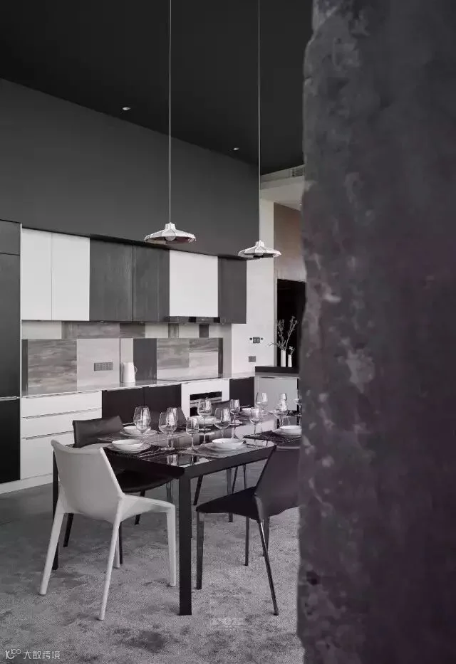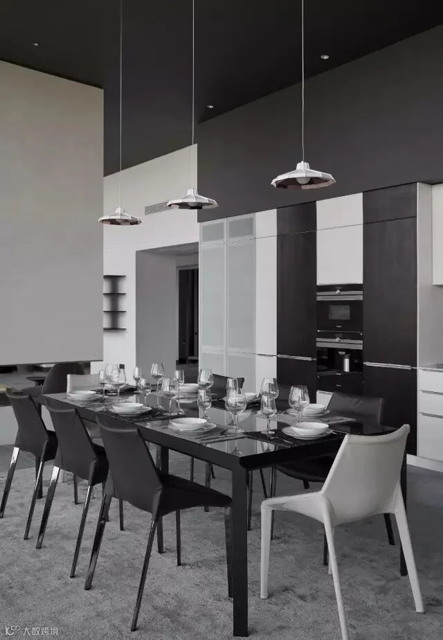 敞开式的厨房设计,把餐厅和厨房融为一体,也是为了能有更好的互动空间,黑白灰的配色 ,干练整洁,餐厅和休闲区用酒精壁炉做隔断,背景做投影,设计师认为优雅的就餐环境就应该需要这些,皮质编织的餐垫搭配玻璃桌面,也是一种传统与现代的碰撞,不露痕迹的表达了设计的内心。