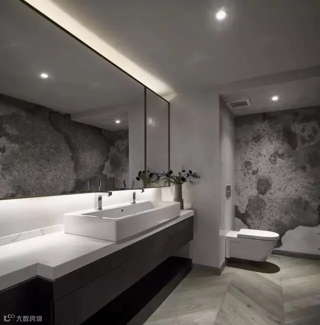 公卫比较狭长,没有采光,在设计中选用了一米长的台盆配双龙头,并定制铜边大面镜子,增强空间感,其他墙面则选用带有水墨的进口墙布,让其卫生间不会那么单一。