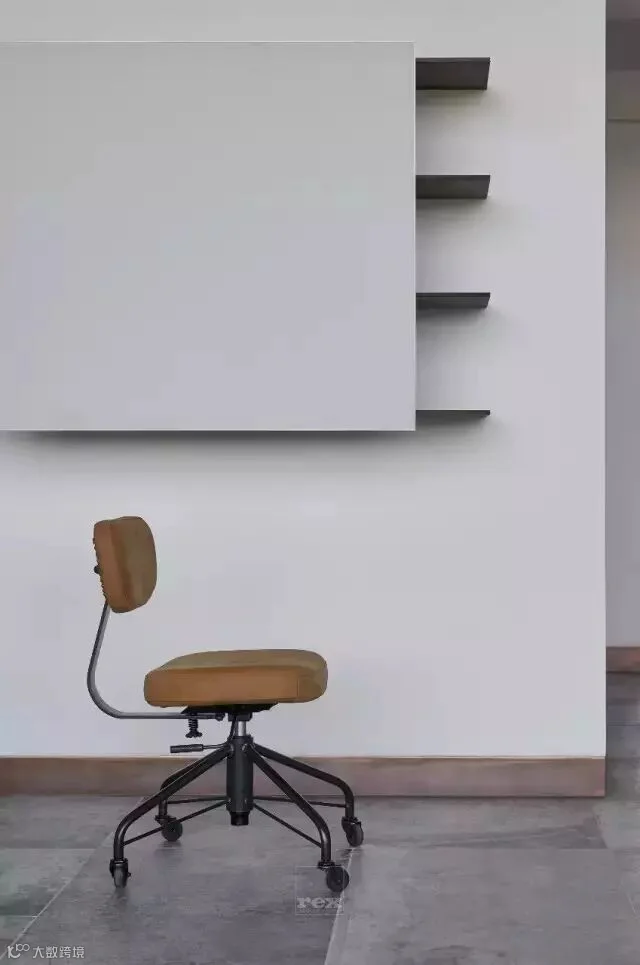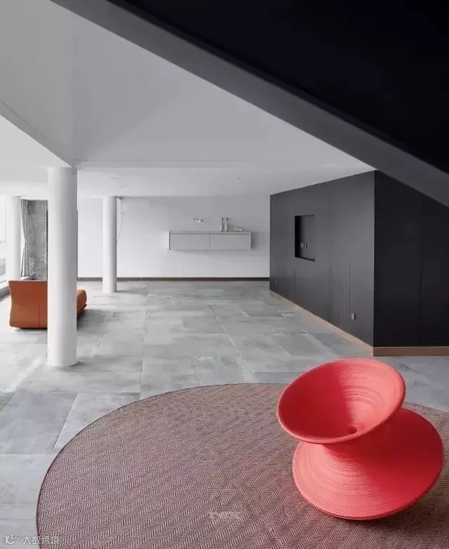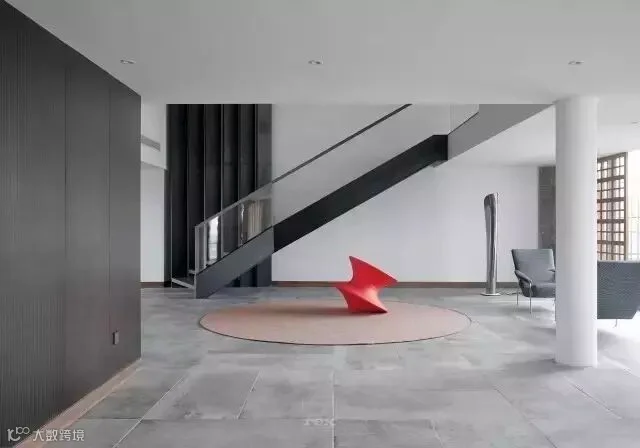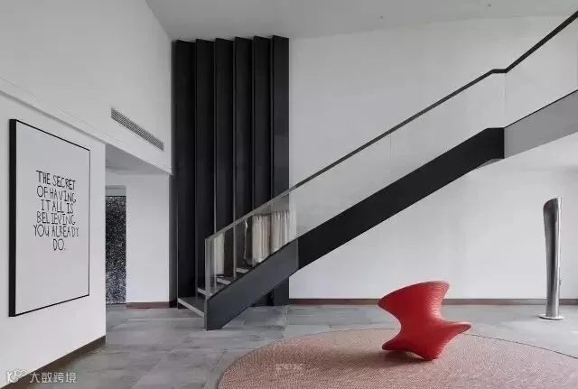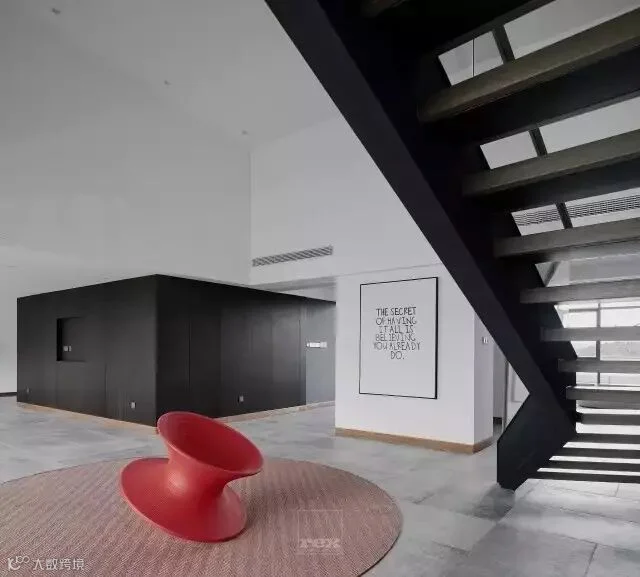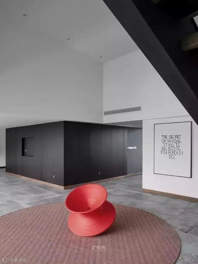 休闲区的对面一侧利用空间高度设计了一个隔层,楼上做为儿子房,而楼下空间设计更多的体现对建筑的理解,从而产生内建筑,作为一个模糊空间,此刻设计师更像是一位建筑师,尽量把空间概念化,斜面楼梯的设计像是一个雕塑,没有过多的去装饰,楼梯口通过一把红色陀螺椅盘活了整个空间,更多是想把这些空间留给主人,可以是艺术品展示区,也可以是健身空间,在一个家里面如果有空间可以这样浪费,足以体现主人的包容和对艺术的追求。