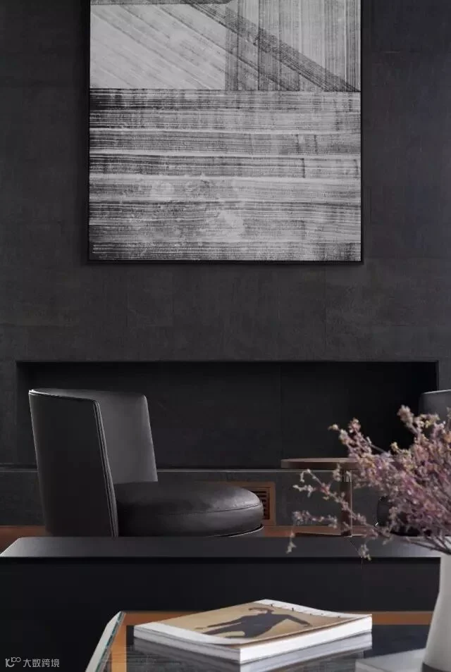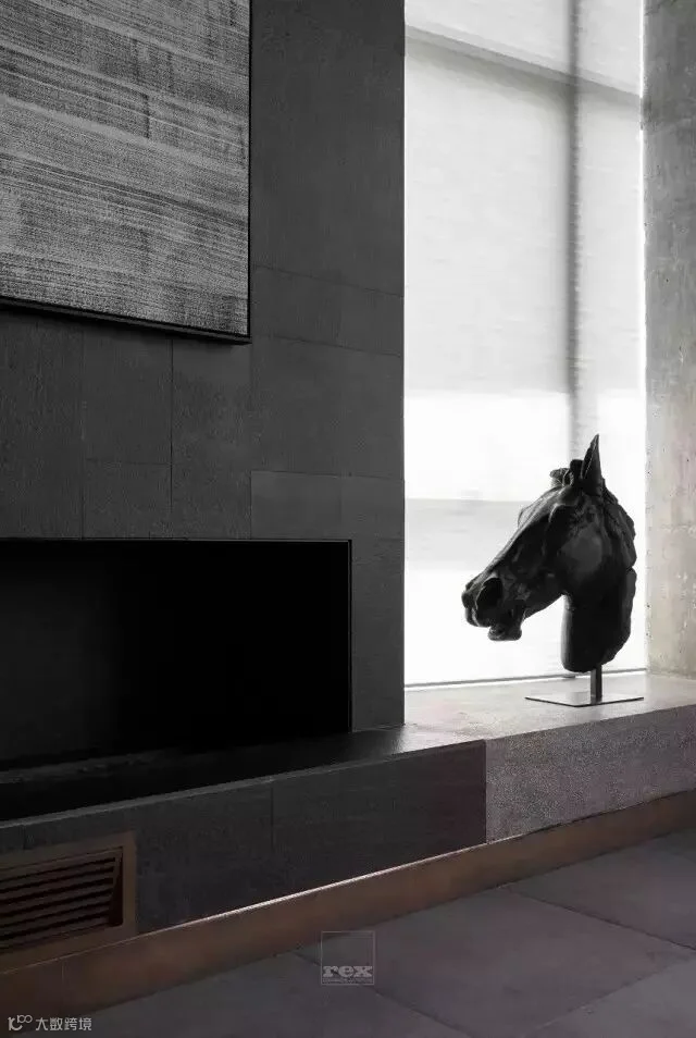 客厅的顶面大胆采用了深灰的涂料,与地面呼应,设计重心就是为了突出整面的书架和壁炉,在这个空间,你可以随手挑一本书籍,配一壶暖茶,或取一堆柴火,围炉而坐,在整个高级灰的空间里享受那份安宁。水磨石,铜制踢脚,裸露的混泥土,这些常见朴实的材质通过设计处理,与抽象笔墨的作品结合,使空间现代时尚又不失东方,这也是设计师在整个作品中所贯穿表达的。在光的运用上,设计中埋下一个伏笔,当傍晚太阳西下时,阳光通过设计的一面格栅洒进时,客厅会出现斑斓的光斑,地毯上,茶几或沙发上,会出现不同的折射,给人一种惊喜和愉悦,设计之外也许就是这个意思。