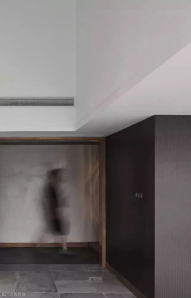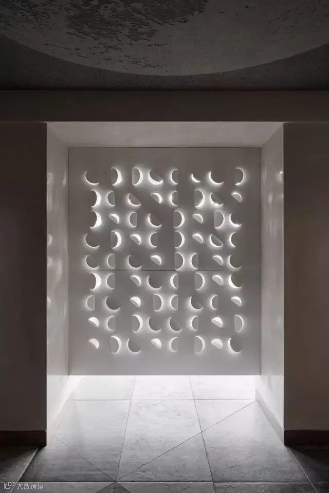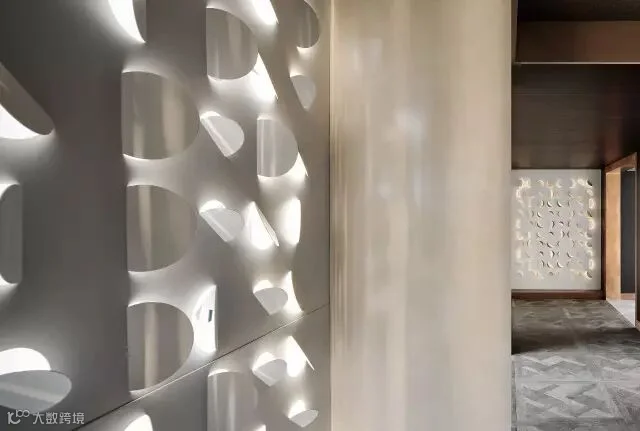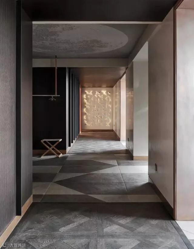 玄关和过道背景也是处理独特,设计师从折纸中提取灵感,让装置艺术取代背景墙,用铁板做折面,让光从不同角度透射出来,无论在哪个角度看就像是在欣赏一幅艺术作品。