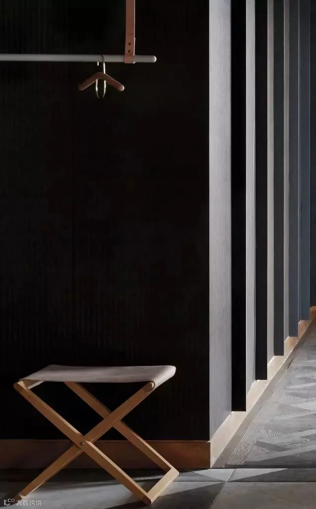 在入门处设计师打破了传统的换衣区,一根皮质的衣杆,一把皮质的坐凳,对面就是鞋柜,处理手法干净利落,打破常规,简约中彰显品质。