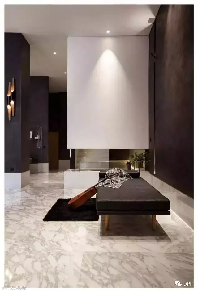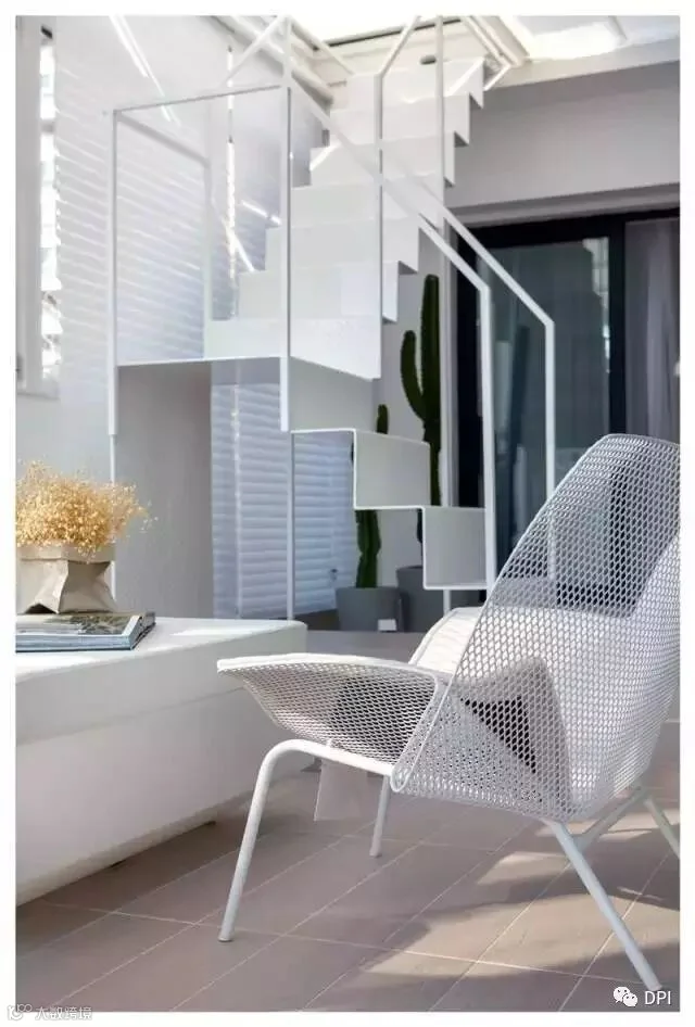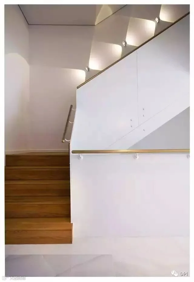 当然简约的设计风格不一定要性冷淡,因为简约只是在通过减少物品以及杂乱的设计,让自己有更多的精力来对待自己喜欢的事情,并不是要减少生活的趣味,所以我们看到在没有任何装饰的楼梯墙面在灯光打开之后,那种光影的变化让整个垂直动线变得丰富而活泼。