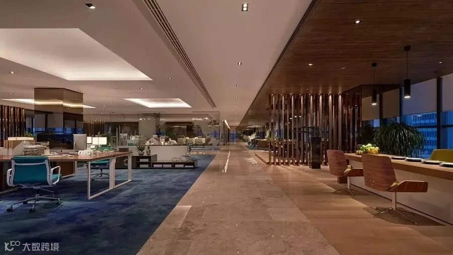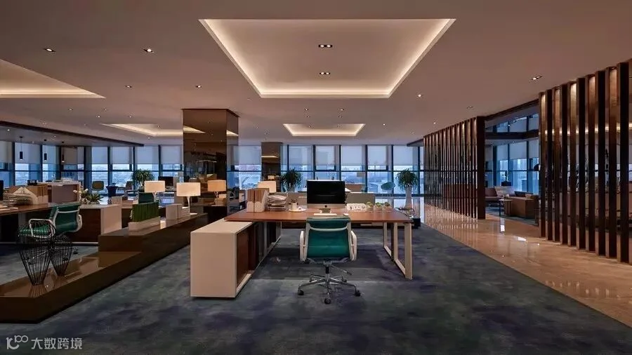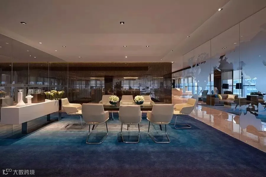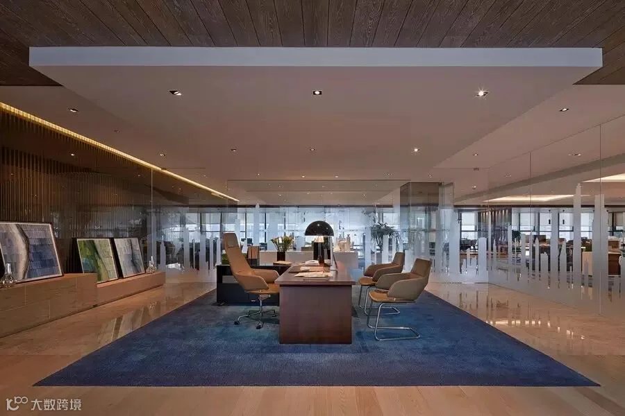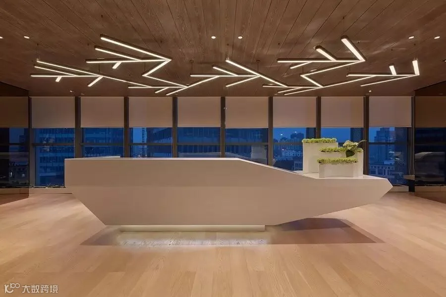 办公室以时尚、高科技术为背景,灯光的运用是办公区的特色之一,天花上树枝状灯光倒影在地面艺术性极强,办公区地毯以湖蓝色呈现,敞开式办公区,营造了一种甲级高端写字楼的氛围。