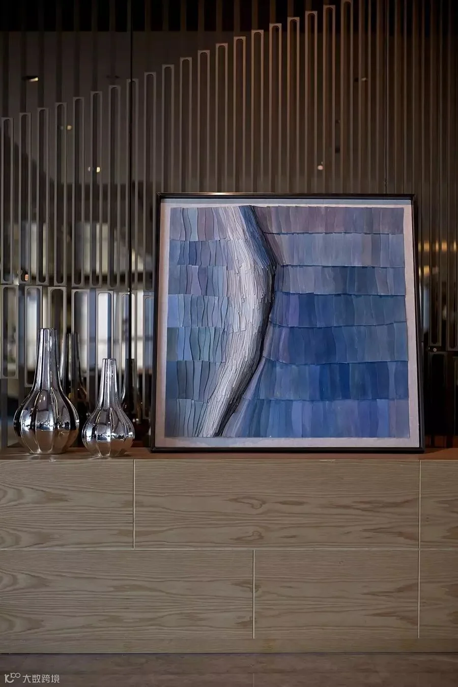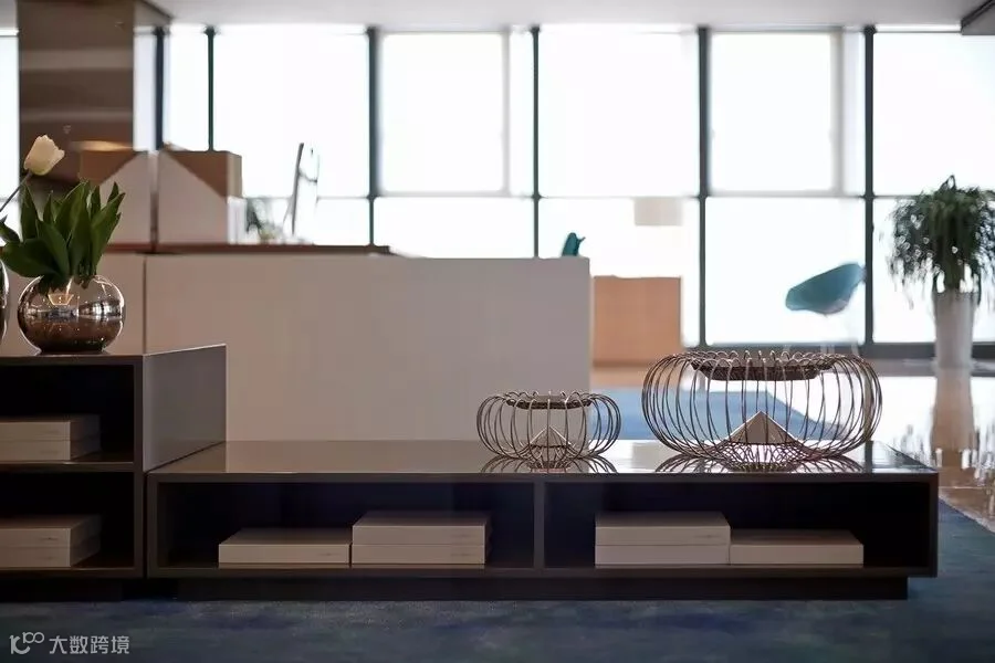 会议室的矮柜以纯白亮面呈现,几本相同厚度的书横放迭高,同一迭书选择一种浅金色,一侧便是矮身的花瓶及植物,几只装饰花瓶的摆设让整个空间干净,舒适。而在会议桌采用镀浅金色支架,透明玻璃与整个干净的基调相呼应,海水蓝的玻璃瓶让空间显得更加清新,犹如阵阵海风。
