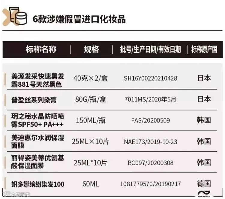其中,“普盈丝系列染膏P13”(80g/瓶/盒,7011MS/2020年5月)标称日本资生堂出品。经上海市浦东新区市场监督管理局现场核查,经销企业声称是假冒产品。该产品在国家药监局进口化妆品数据库中也查询不到。