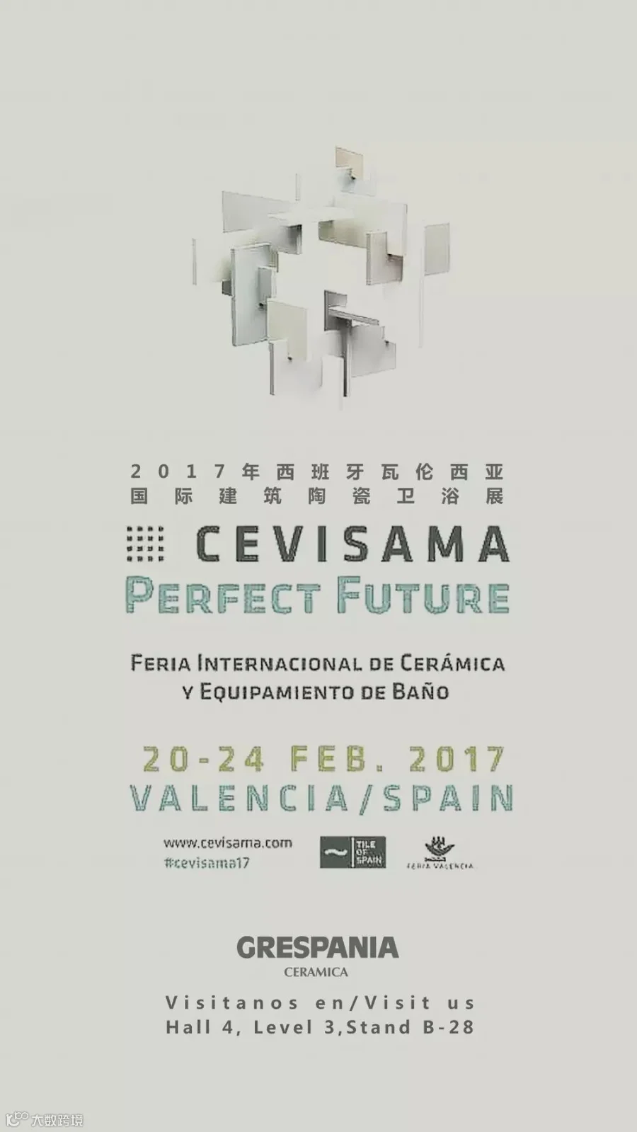 2017年2月20-24日,第35届西班牙瓦伦西亚国际建筑陶瓷卫浴展将在瓦伦西亚国际展览中心隆重召开。届时,西班牙GRESPANIA(帕尼亚)瓷砖将在4号馆3楼B-28展位恭候全球客商的观摩和指导。欢迎登陆http://www.grespania.com/ref51012en填写资料,获取免费入场的直通证。