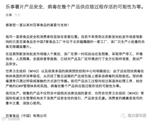 继通过“百事中国”对外强调百事可乐未受到新冠输入个案影响后,21日晚上,百事食品(中国)有限公司(下称“百事食品公司”)再度通过“乐事”微信公众号,对外披露了百事食品公司在华遭遇新发地批发市场输入个案的更多细节,并强调“乐事薯片产品安全,病毒在整个产品供应链过程存活的可能性为零”。