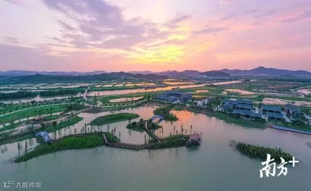 日暮斜阳,紫红的霞晕染了天边。远眺中山翠亨国家湿地公园,咸淡水交汇处,海岸湿地与人工湿地浑然一体,红树林、盐水沼泽彼此交织。一线余晖下,几只飞鸟,三五成群,飞入镶着“金边”的云里,难再寻。