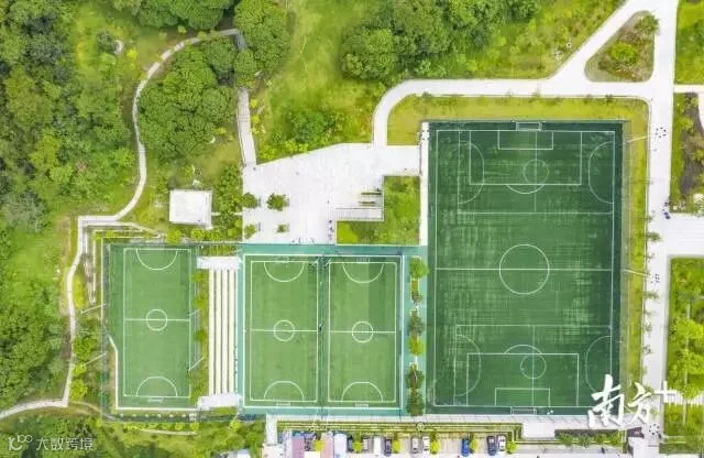 金字山公园里新建了四个足球场,球场背靠山林,球场旁设置了洗手间、更衣室。