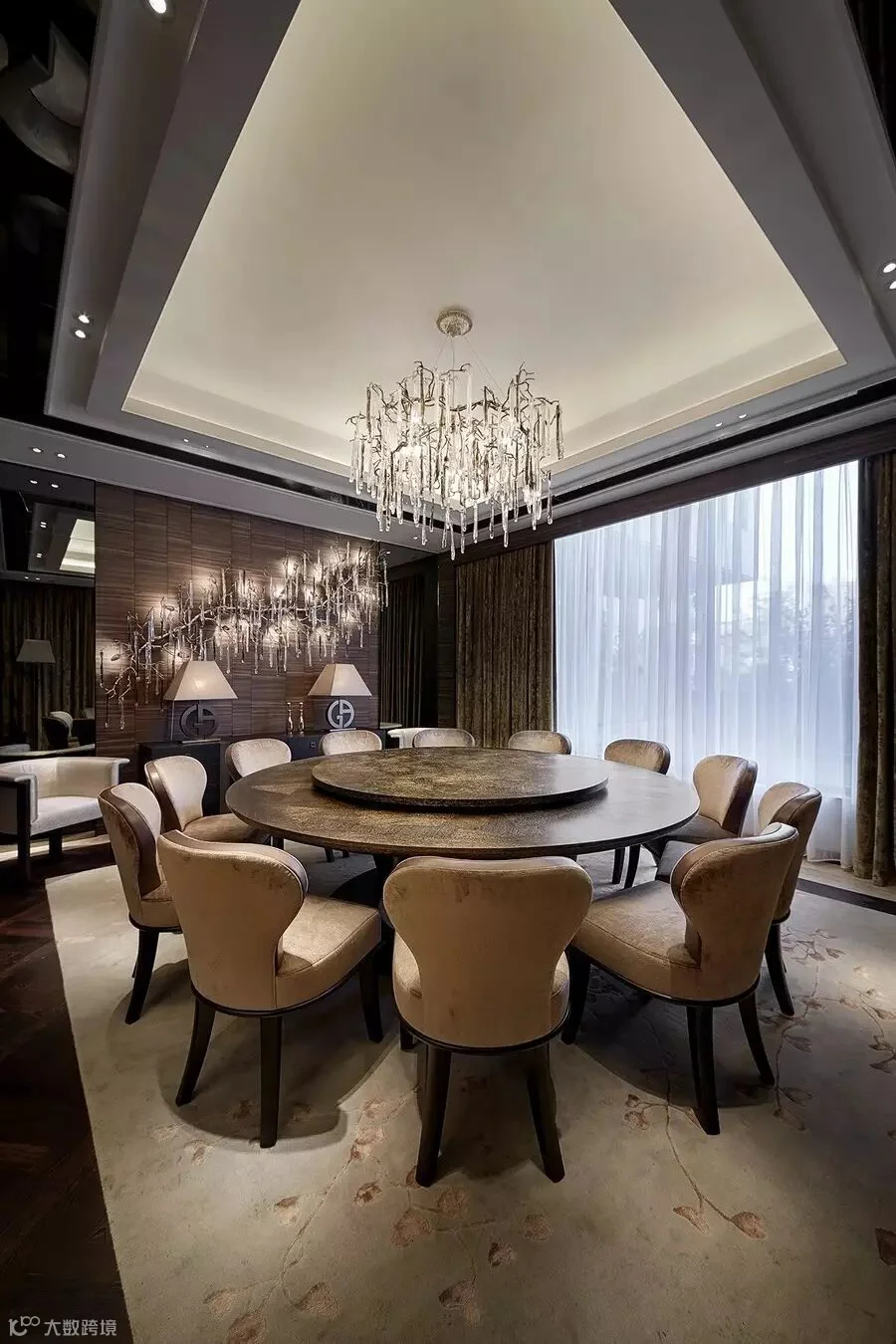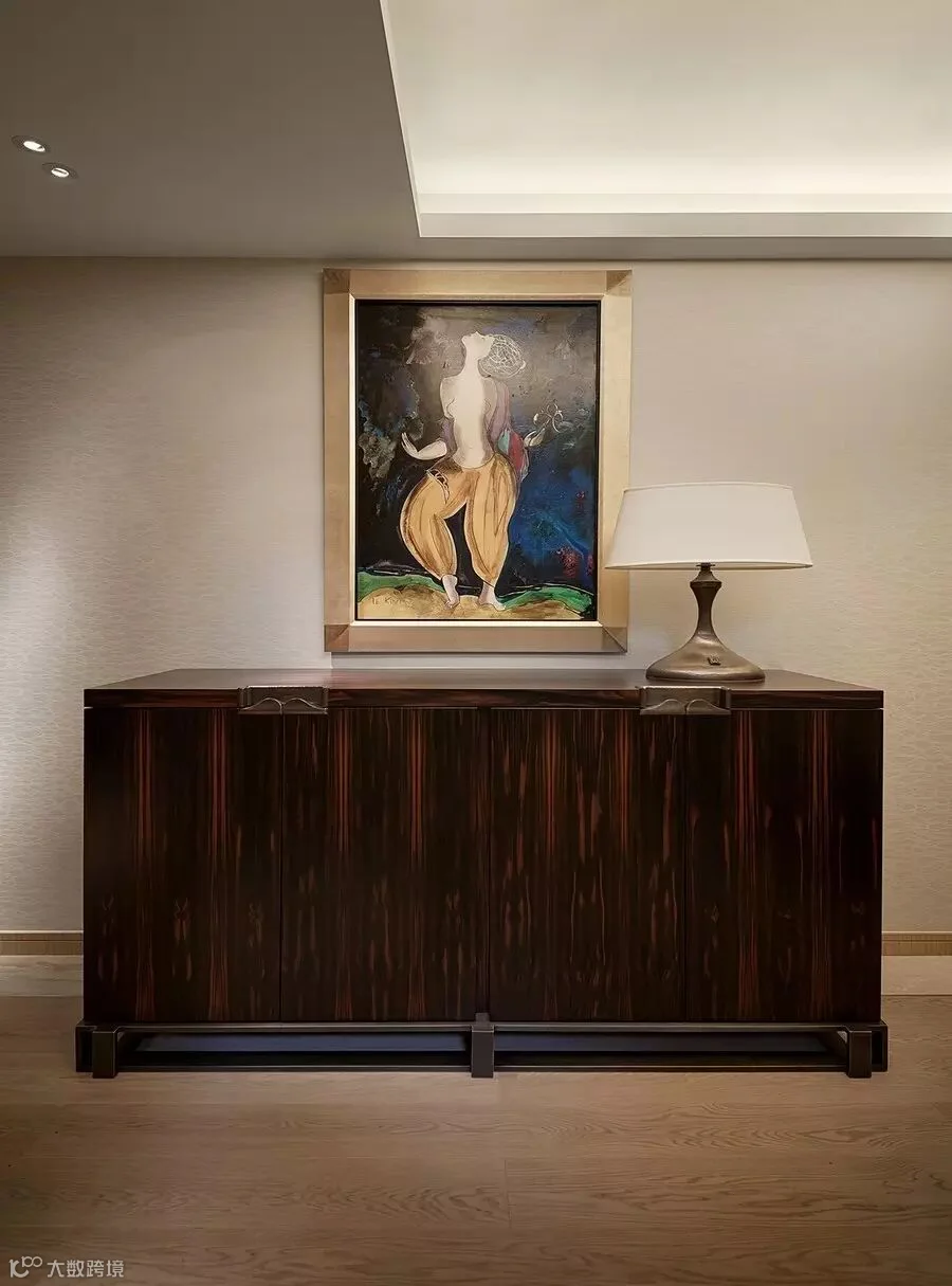 在家具及灯具的选择上,设计师直接从欧洲进口,主要以Armani、Hermès及令意大利傲娇的Promemoria品牌为主,据悉一套别墅家私灯具约1500万人民币,而艺术挂画除外。这些高端品牌家具虽然简约,却绝不简单,它们不造作、不浮夸、不喧嚷,每一件都是传承经典的情感累积,在卓越的手工技艺和细节处理下展现出超越寻常的面貌,将沿袭多年的传统手艺与最新的现代技术结合,以此表达设计与质感的纯粹结合。比如餐厅吊灯犹如一件艺术品,每一个细节都独立而相呼应,每一处都经得起细细观赏与琢磨。