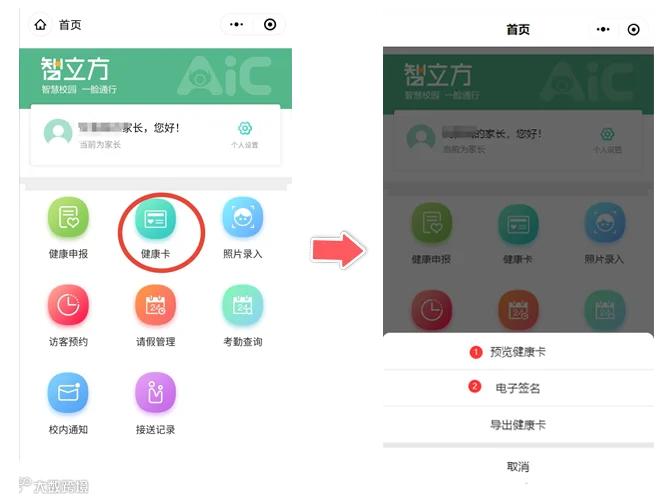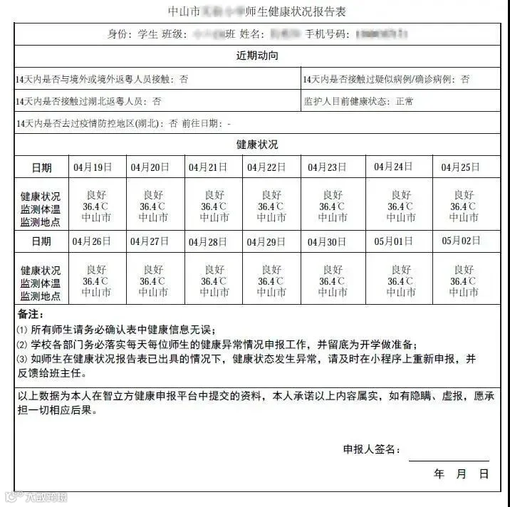 返校前学生根据学校具体安排,完成至少连续7天打卡后由监(照)护人在平台“健康卡”上电子签名确认。(无需导出及打印)