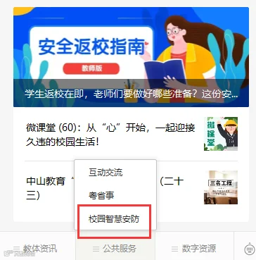 1. 扫码关注“中山市教育和体育局”微信公众号,点击菜单栏【公共服务】-【校园智慧安防】,进入操作界面。