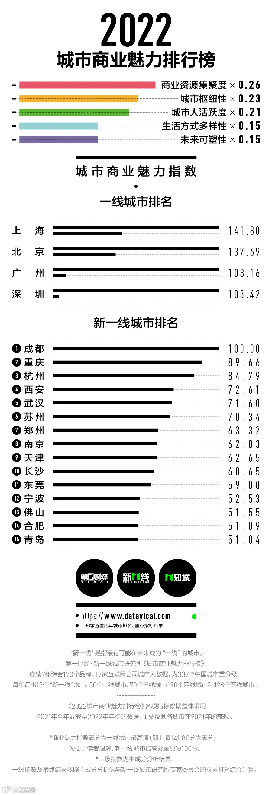 采用170个主流消费品牌的商业门店数据、17家各领域头部互联网公司的用户行为数据和数据机构的城市大数据,《城市商业魅力排行榜》每年都围绕商业资源集聚度、城市枢纽性、城市人活跃度、生活方式多样性和未来可塑性五大一级维度来评估337座地级及以上城市的发展情况。