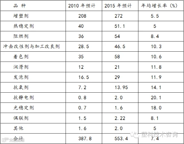 各类塑料助剂“十二五”末的消费量预计及“十二五”期间的平均年增长率预计见下表: