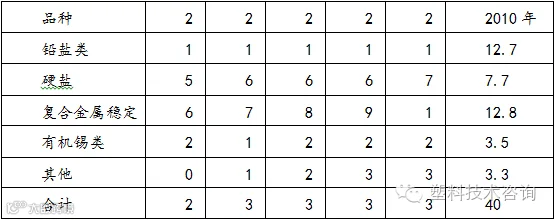 “十五”末,热稳定剂年消费量为27.2万吨,到“十一五”结束时,热稳定剂产量达到40万吨,增长47.1%。据不完全统计,2009年我国热稳定剂总产量达到36万吨。其中铅盐类占35.0%,硬脂酸盐类占19.44%,复合型占 29.44%(部分含铅),有机锡类占7.77%、其他占8.35%。 “十一五”期间热稳定剂产量统计: