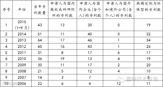 我收集了一组专利数据,从2006年至2015年9月份。可以从一个侧面来反映行业进步的努力和能力:从2006年至2015年9月涉及稳定剂专利总数为372件:其中申请人为高校或科研院所为109件,申请人为企业(含个人)为229件,申请人为国外或境外公司(含个人)为34件,列出下表: