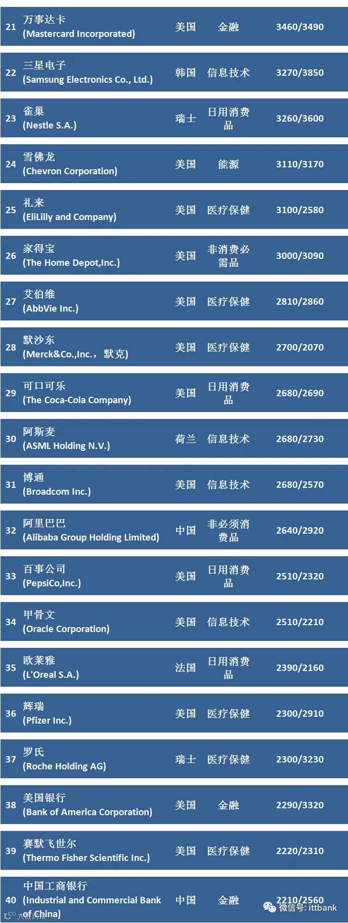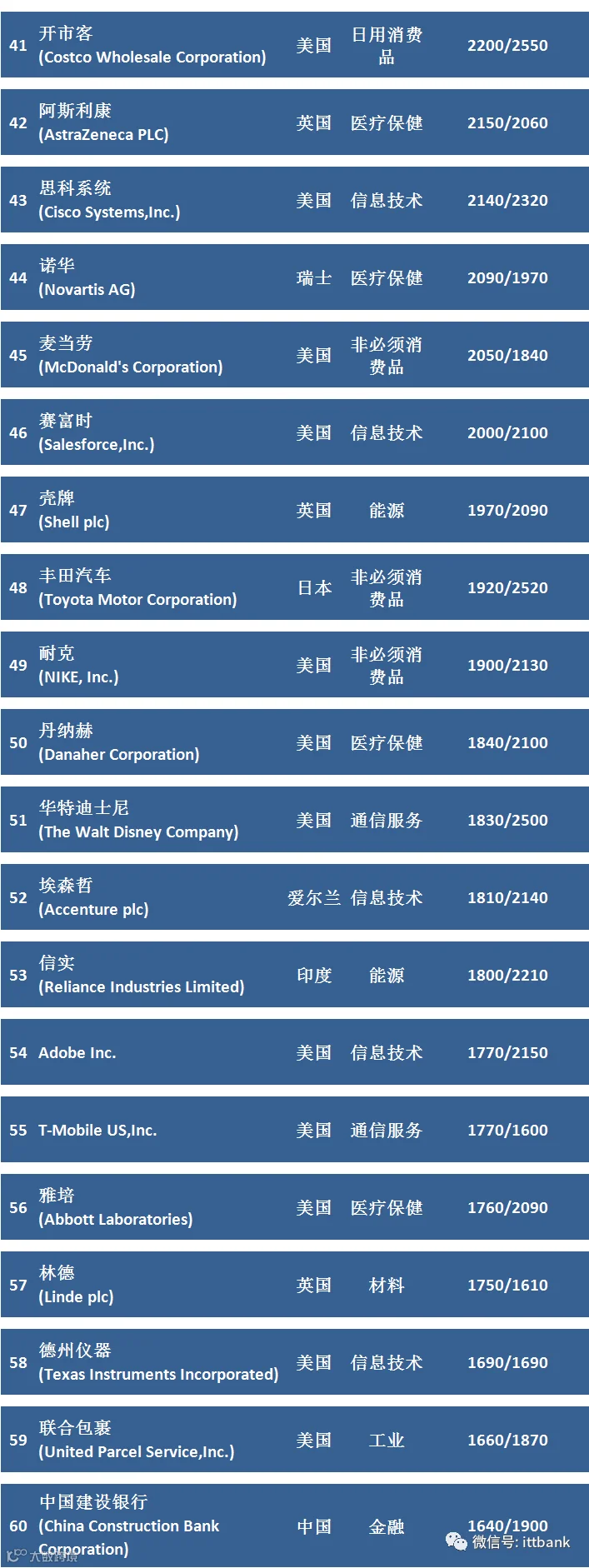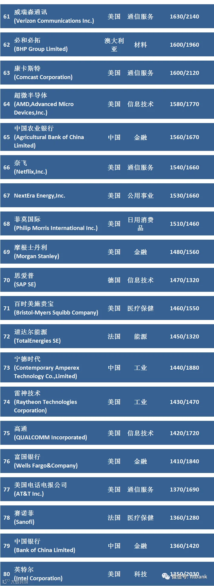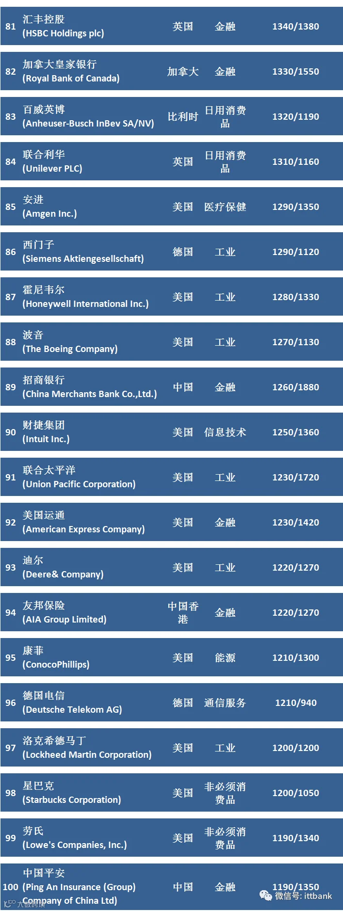 100家上榜公司中,科技企业有18家,总市值8.65万亿美元;医疗保健企业16家,总市值3.94万亿美元;金融企业17家,总市值3.82万亿美元;非消费必需品企业10家,总市值3.57万亿美元;电信服务企业10家,总市值3.44亿美元;能源企业7家,总市值3.29万亿美元;日用消费品企业10家,总市值2.47亿美元;工业企业9家,总市值1.2万亿美元;材料企业2家,市值3350亿美元。公用事业企业1家,市值1530亿美元。