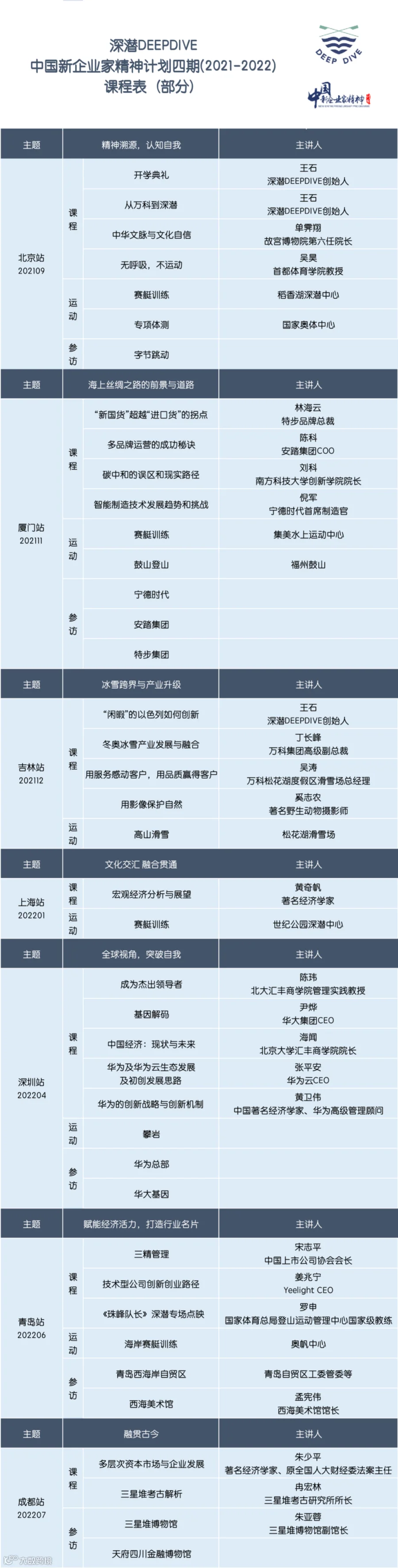 “中国新企业家精神”计划是深潜DeepDive2018年回国后的全新课程产品,基于身、心、体全方位锻炼的设计理念,将运动健康和艺术培养元素融入课程体系,打造了独特的生命力课程体系,致力于塑造现代企业家的健康人格和潜力提升,挖掘个体生命潜力,力助企业家打造阳光健康的成功企业、拥有阳光健康的成功人生。