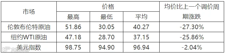 布伦特原油期货价格分别为每桶37.15美元、40.27美元,分别比上期下跌25.86%、27.30%。