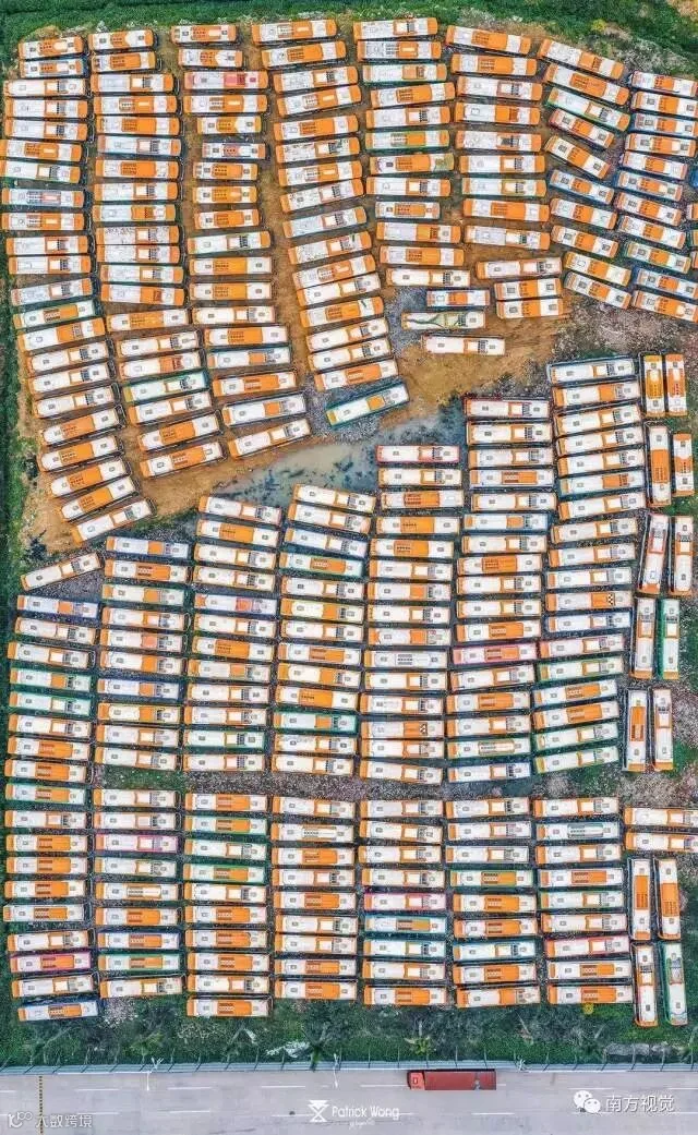 ▲4月6日,俯瞰广州白云区的一处公交停放区,车辆数量众多,整齐停放如俄罗斯方块。黄英翰 摄