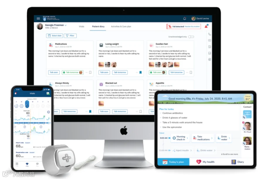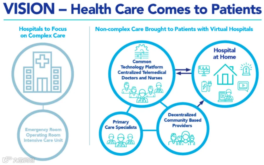 远程医疗的局限性也对家庭医疗的监控级别提出了更高的要求,这也是居家医院(hospital-at-home )出现的原因。居家医院的目的是为病人在家中提供医院级别的护理。尽管病人不在医院,但他们可以通过虚拟探视、数字沟通和远程生物识别监测技术与其护理团队保持密切的联系。