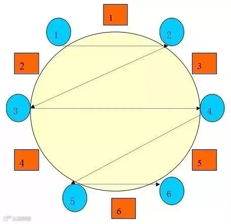 领导为偶数时,1、2号领导同时居中,2号领导依然在1号领导左手位置,3号领导依然在1号领导右手位置。可参见下图的座次排列图: