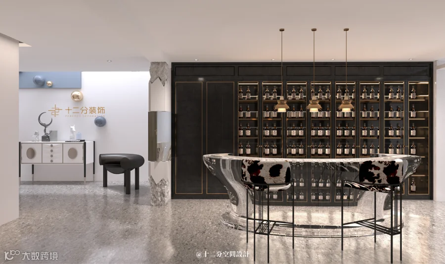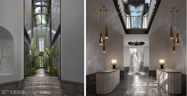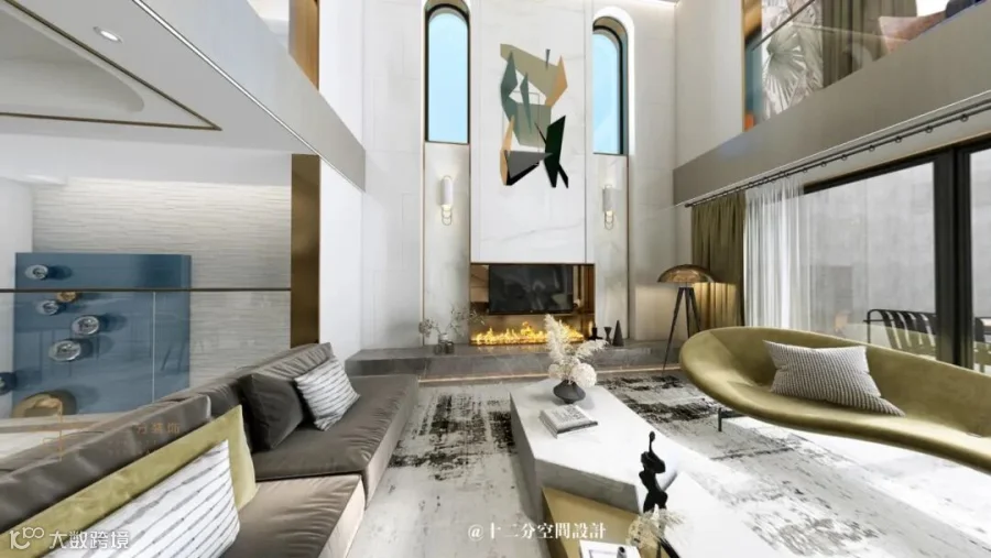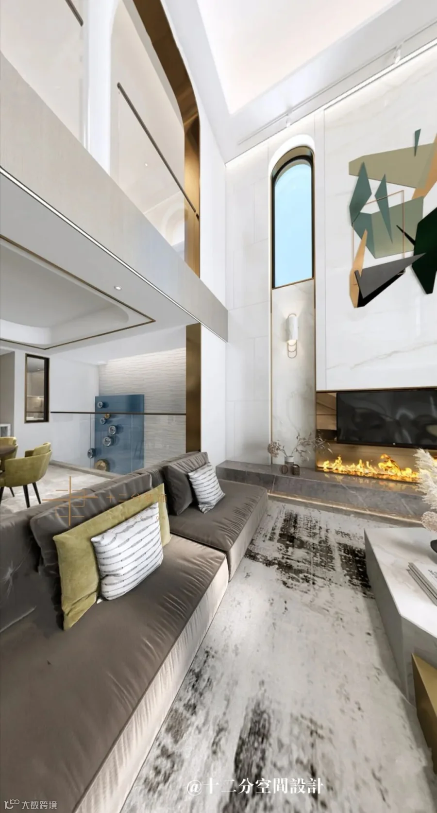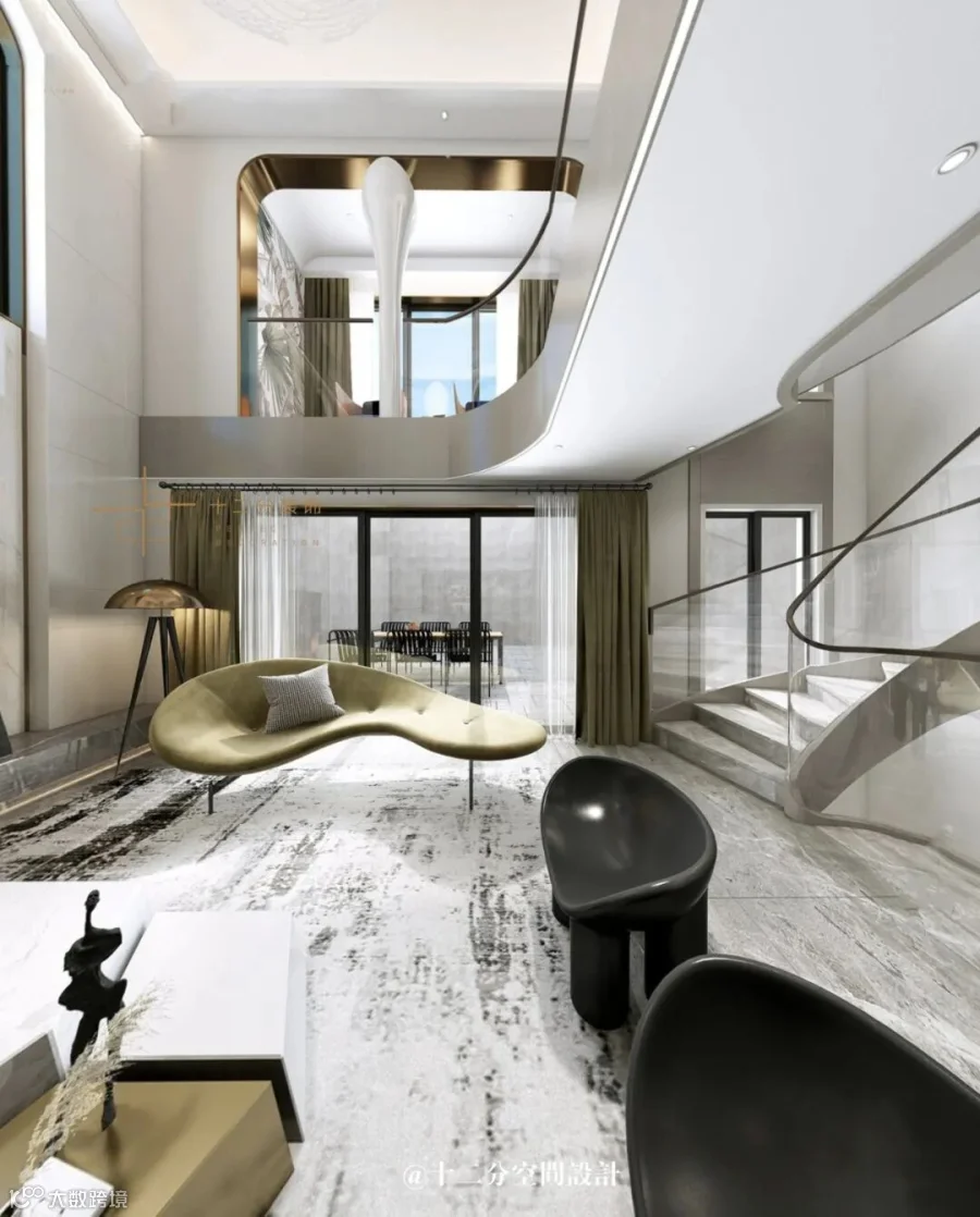 下沉一楼大厅和花园至负一层,形成高挑空大厅,一楼环廊成为空间交互交响乐,硬装基调以浅色调为主,使用自然纹理感奢石大板材料搭配素雅大空间,通透明亮,用金属线条做局部点缀,软装在灯具和饰口上配合一些金属质感的产品,局部夸张艺术块面艺术装饰点缀进行穿插,整体呈现一个干净大气、优雅精致、时尚个性与艺术摩登交融的空间。