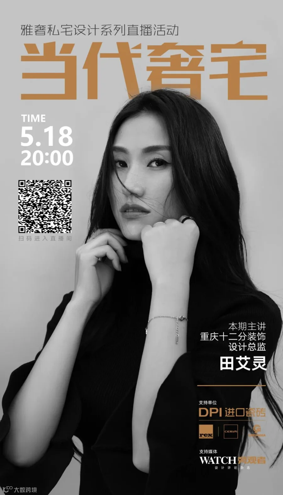 2020年5月18日 20:00,由DPI进口瓷砖、WATCH旁观者联合策划支持的《当代奢宅》直播活动,本期将邀请十二分装饰 设计总监&品牌策划人 重庆女设计师联盟木兰会联席会长 田艾灵老师,与大家分享关于高端奢宅的设计,共话设计理念。田老师将带着她20年的资深从业经验,透过她独特的设计视觉,将与您展开深入的交流、探讨,欢迎广大设计师、业主朋友关注直播间,一起交流、互动。