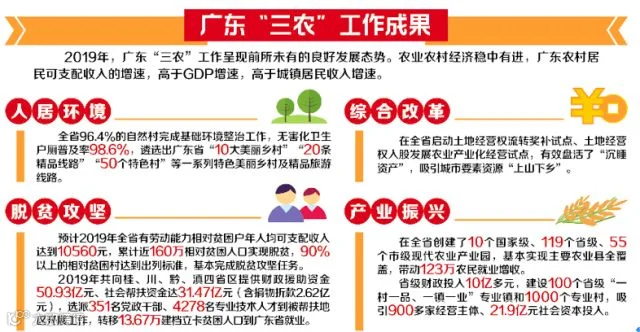党的十九大以来,广东省把实施乡村振兴战略作为解决区域和城乡发展不平衡不充分问题、实现“四个走在全国前列”的战略举措,以前所未有的政治高度、工作强度、投入力度,举全省之力推进乡村振兴。目前,广东乡村振兴政策体系基本建立,乡村振兴保障力度明显加大,农村人居环境整治初见成效,富民兴村产业提速发展,脱贫攻坚成效凸显。