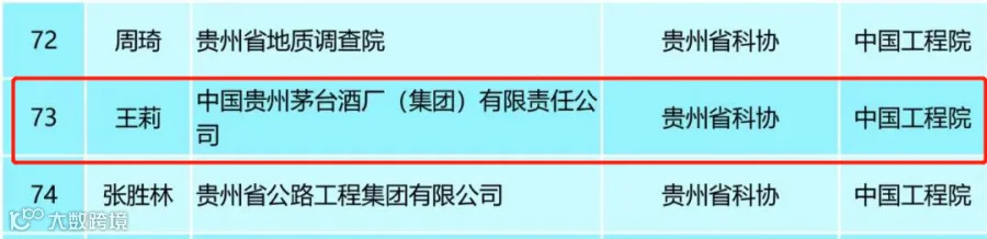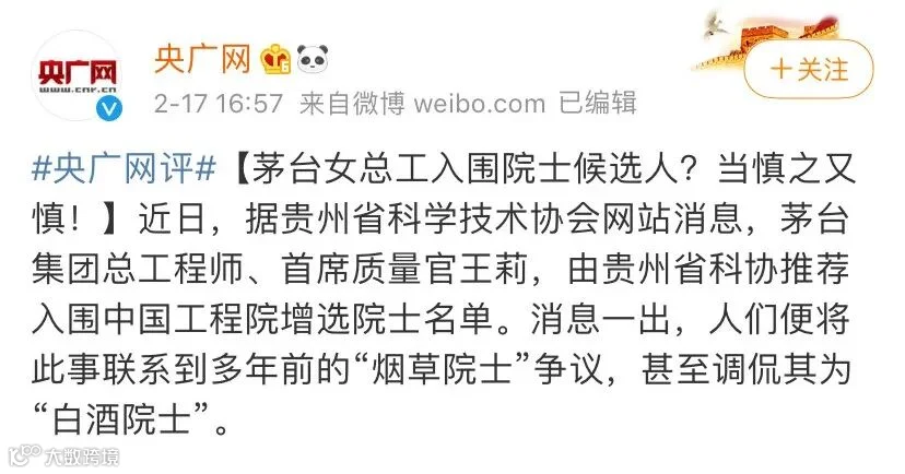 2月17日,贵州茅台在官方公众号上发布消息称,茅台集团总工程师、首席质量官王莉入围中国工程院增选院士名单。