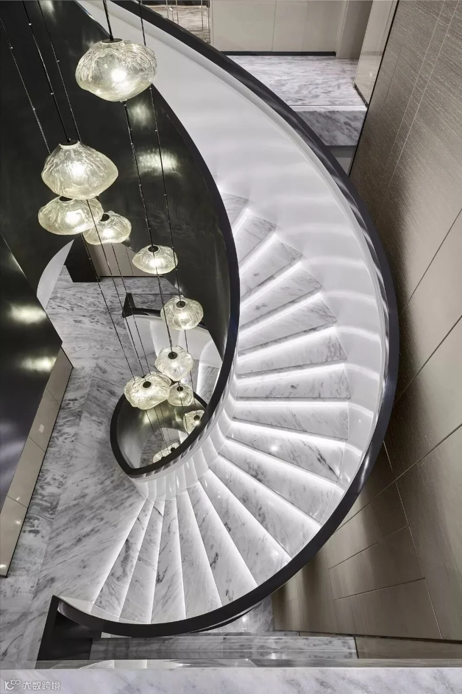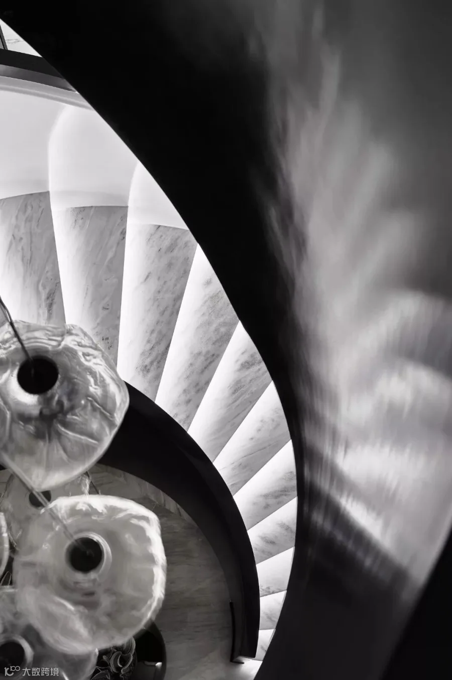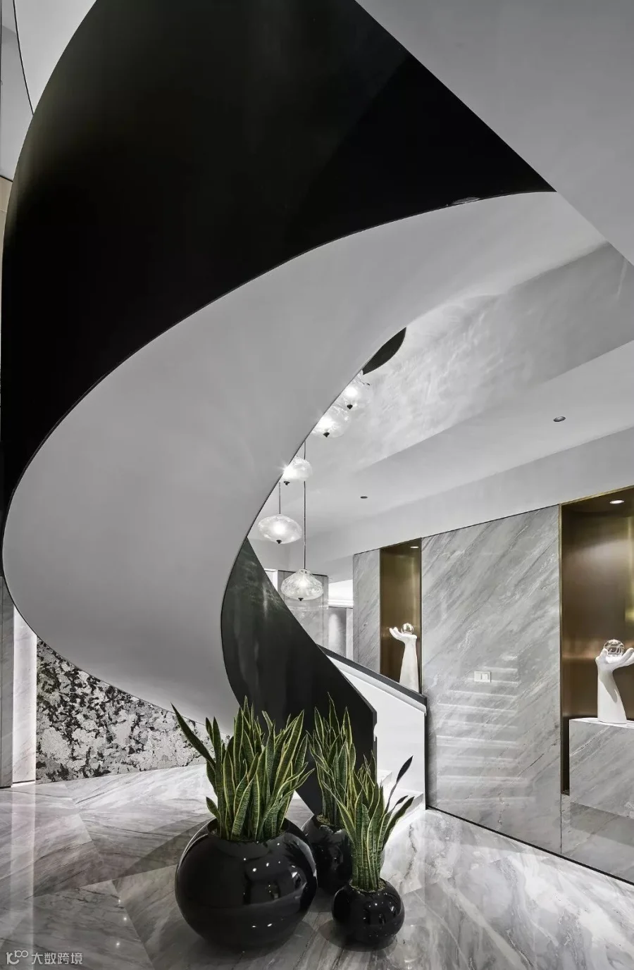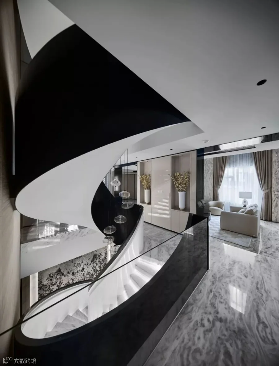 浑然奔放的黑白色调楼梯犹如一位艺术家在动情舞蹈,大尺度的旋转而上,用默默无声的自由方式,琉璃般的镌刻着肌理的灯饰带来优雅的美学效果,再次将艺术与未来生活紧紧交融。