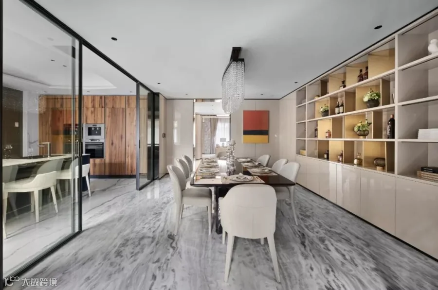 餐厅延续了客厅的配色材质,使整个空间更显开阔宽敞,伴随着似满天星辰般的灯饰缓缓垂落,与暖色透明的玻璃门遥相呼应,让整个空间更富有当代感染力与艺术表现力。